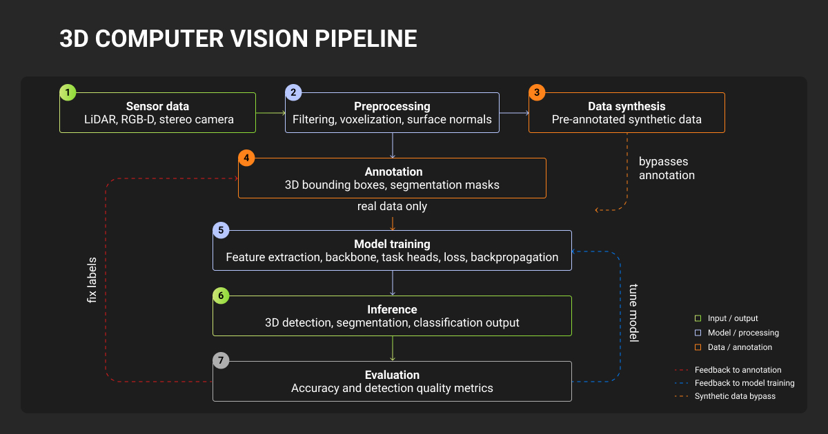 In 3D CV, your pipeline consumes point clouds, often at 10 Hz, plus time-synchronized camera and IMU data. Models like PointPillars, CenterPoint, TransFusion, and BEVFormer predict 3D cuboids with nine parameters: x, y, z, length, width, height, yaw, and two velocity components. Ground truth comes from annotators working in 3D space across synchronized modalities. A single labeled LiDAR sweep for a dense urban scene takes significantly longer than any 2D frame, typically an order of magnitude more.