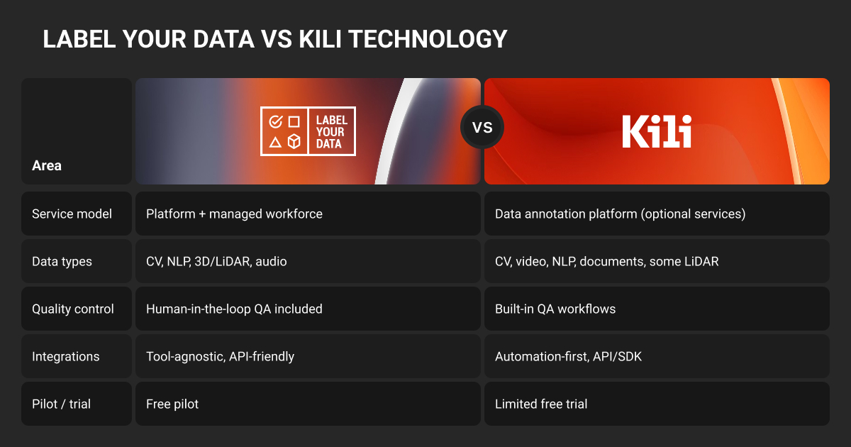 - Label Your Data provides managed annotation services handling your workforce. Kili Technology provides platform infrastructure for teams managing their own annotators.