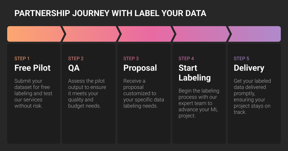 If you choose managed annotation services, run a free data pilot with Label Your Data. Our outsourcing strategy has helped many companies scale their ML projects. Here’s why: