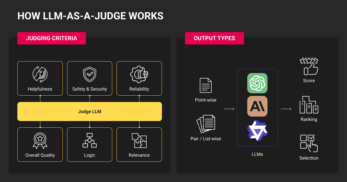 - LLM-as-a-Judge uses large language models to automatically evaluate AI outputs at scale.