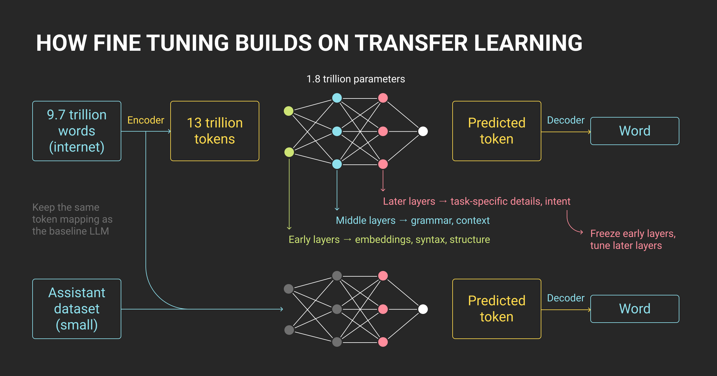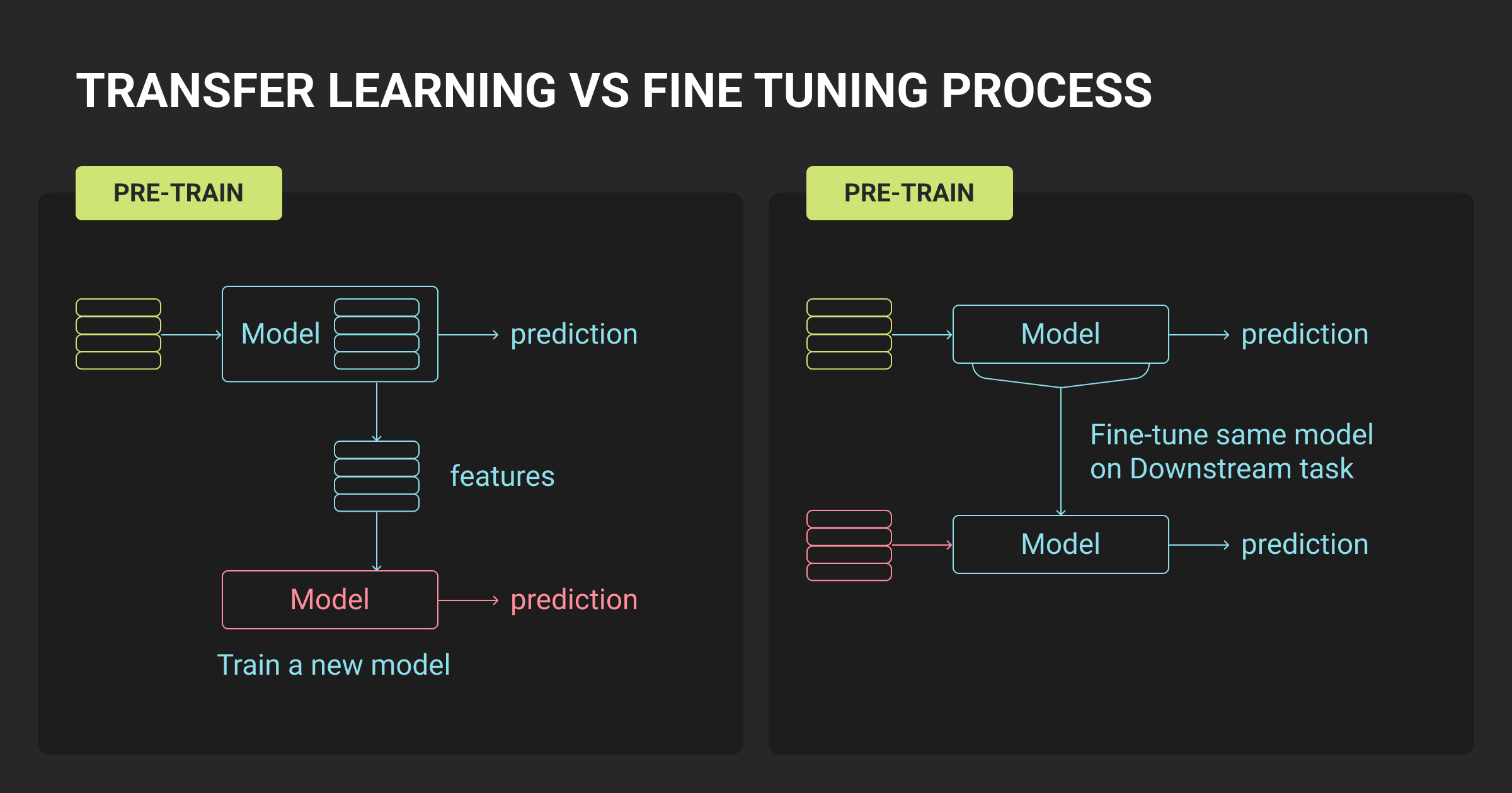 In most computer vision, NLP, and speech recognition pipelines, training from zero is inefficient. Transfer learning allows ML engineers to build on large foundation models trained on diverse machine learning datasets, while fine-tuning adjusts part of that model to match new data.