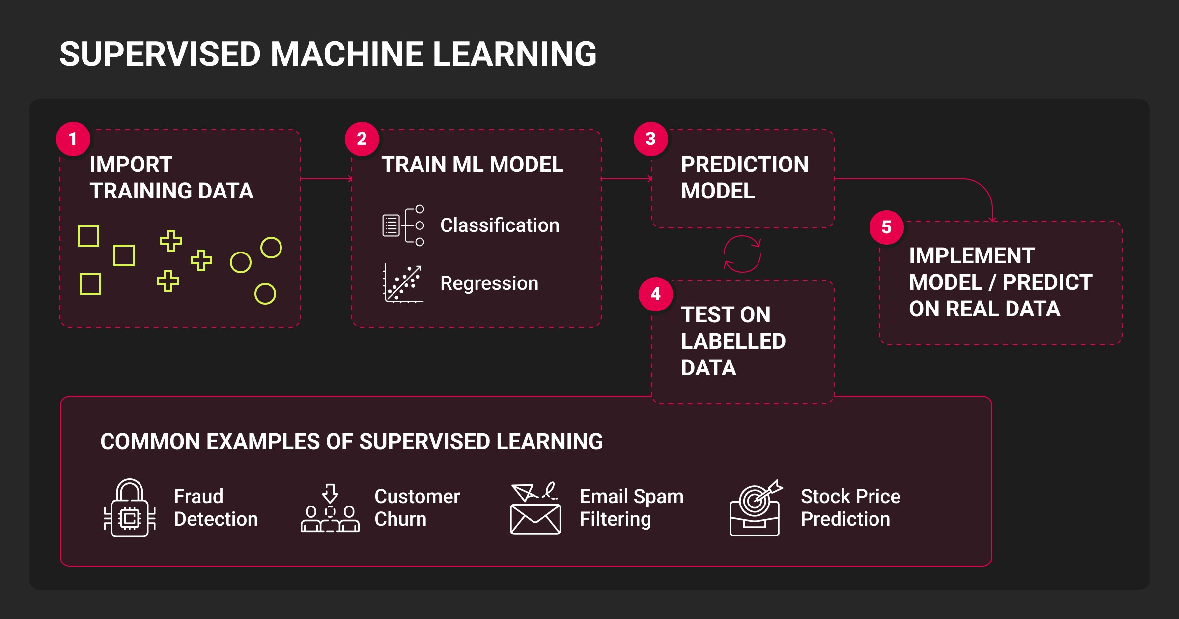 Supervised learning is used when you have labeled input-output pairs and want to predict outcomes. Classification models sort inputs into discrete categories (e.g., spam detection), while regression predicts continuous values (e.g., demand forecasting). Most business ML starts here.