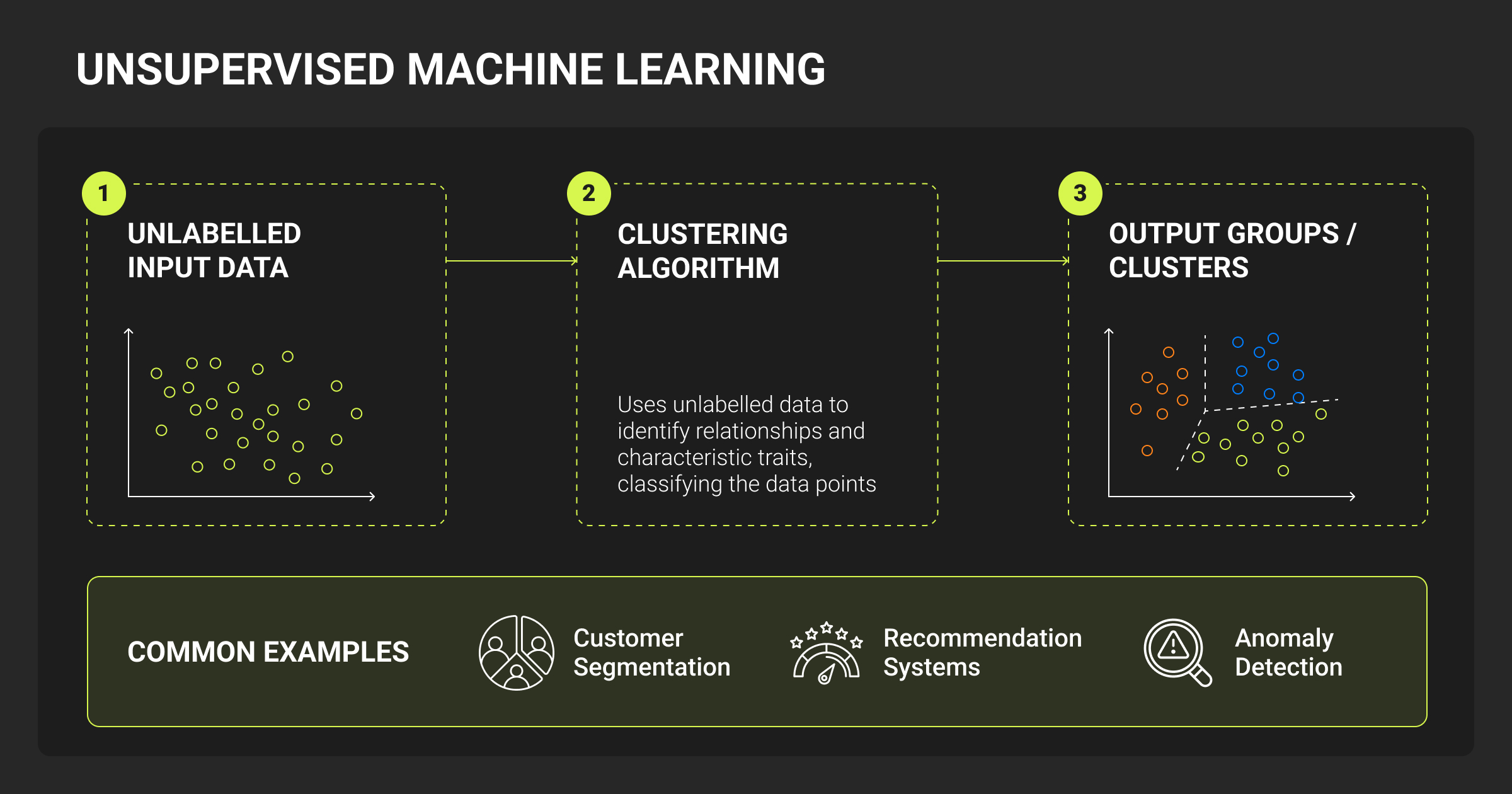 Evaluation can be tricky: no labels means you measure cluster separation or reconstruction error, not accuracy.