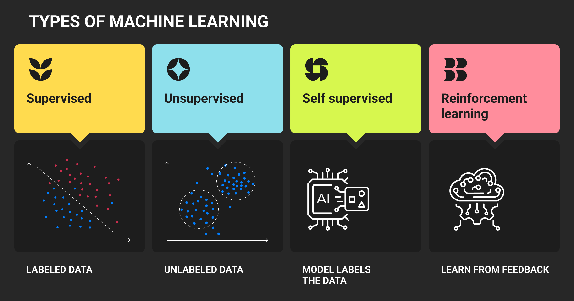 The four main types of machine learning are supervised learning, which trains on labeled data; unsupervised learning, which finds patterns in unlabeled data; reinforcement learning, where models learn through rewards and actions; and semi‑supervised or self‑supervised learning, which uses limited or indirect labels to improve training efficiency.
