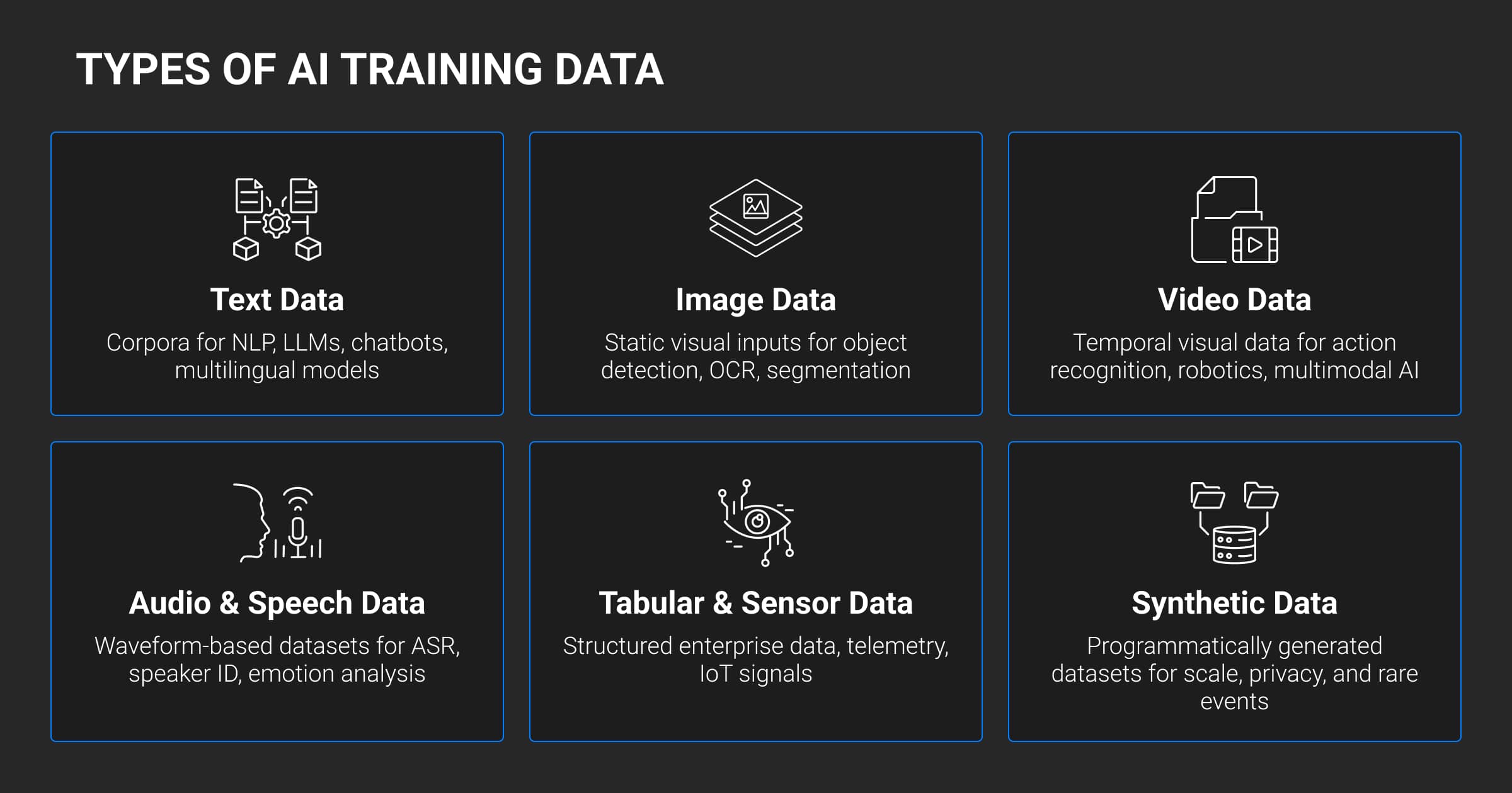 Understanding the new data supply chain requires recognizing that every AI system depends on distinct data types, from text and video to tabular and synthetic streams. They form the raw material of ML intelligence.