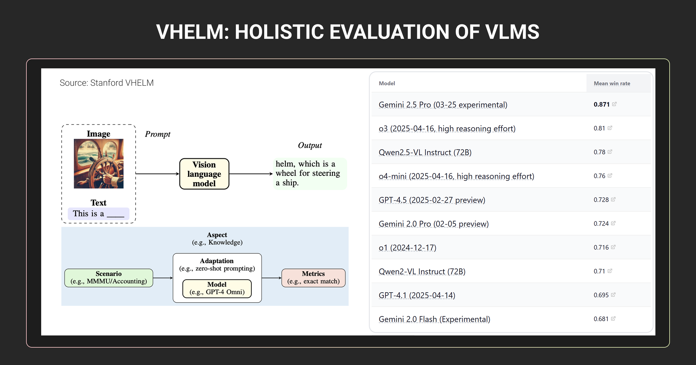 Stanford’s VHELM benchmark provides unified evaluation across nine aspects including perception, reasoning, and bias, producing standardized leaderboard comparisons.